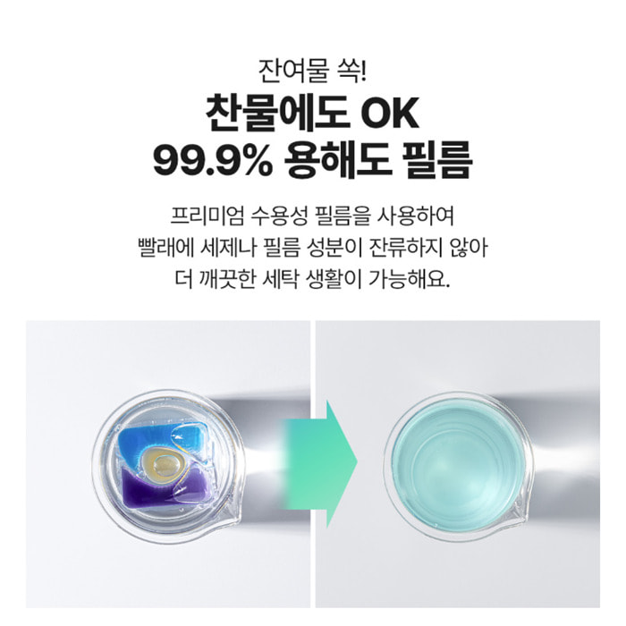 Капсулы на 99,9% растворяются в холодной воде (до 5°С) за счёт использования высококачественной водорастворимой плёнки и не оставляют следов на тканях.