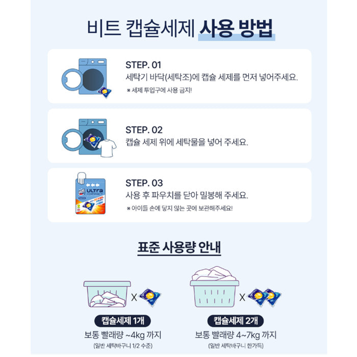 Способ применения: отрезать верхнюю часть упаковки ножницами выше зип-лока (застёжки) и открыть пакет, потянув края в разные стороны. После использования плотно закрыть пакет, проведя пальцами вдоль застёжки, прижимая обе стороны друг к другу. Сухой рукой положить капсулу на дно в пустой барабан стиральной машины, затем загрузить бельё. Капсулы полностью растворяются в воде.