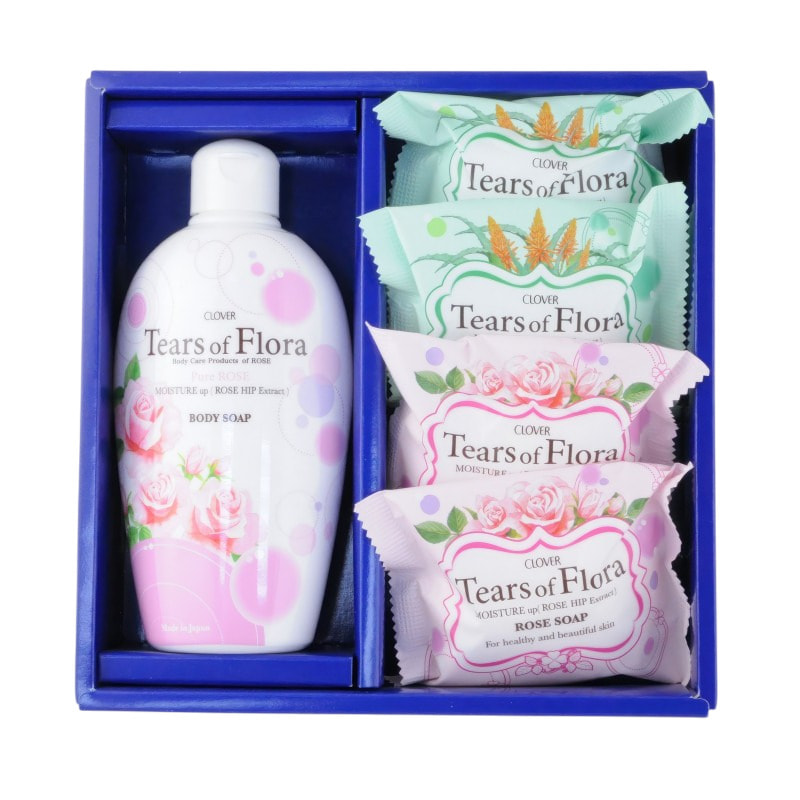 Clover "Flora Set Флора и Алоэ" Подарочный набор мыло туалетное косметическое и жидкое мыло для тела, 70 г х 4 шт, 250 мл х 1 шт.