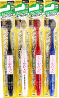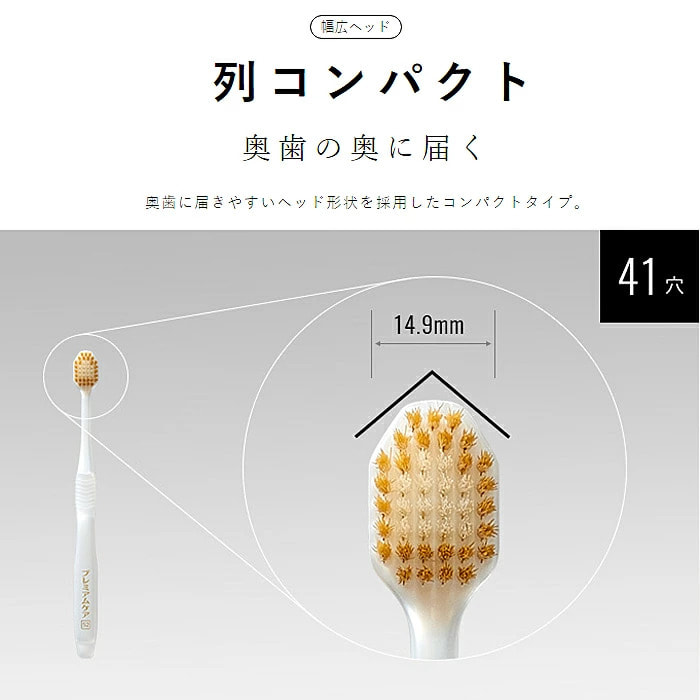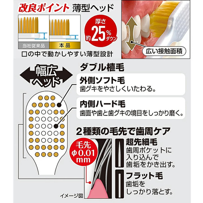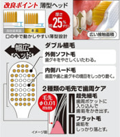 Длинные сверхтонкие кончики щетинок (0,01 мм) верхнего ряда проникают в зубодесневой карман и вычищают зубной налёт. Короткие плоские щетинки нижнего ряда обеспечивают качественную полировку. Головка щётки с тонким основанием легко двигается в полости рта, проникает в труднодоступные места и достаёт до дальних коренных зубов.