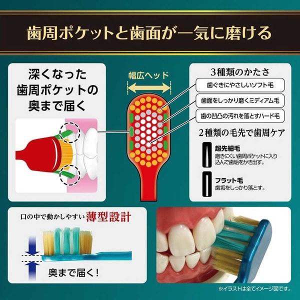 Комбинированная щетина трёх видов (жёсткая, средняя, мягкая) удаляет загрязнения, повторяя форму зубов, тщательно очищает поверхность и зубодесневой карман.