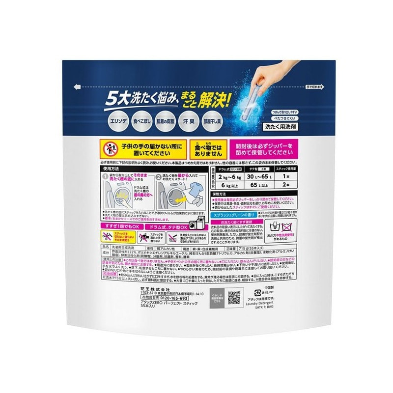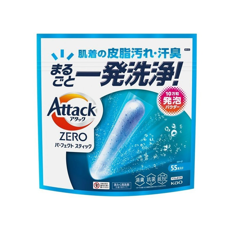 KAO "Attack Zero Perfect Stick" Стиральный порошок в стиках, с антибактериальным и дезодорирующим эффектом, с ароматом свежей зелени, 55 стиков.