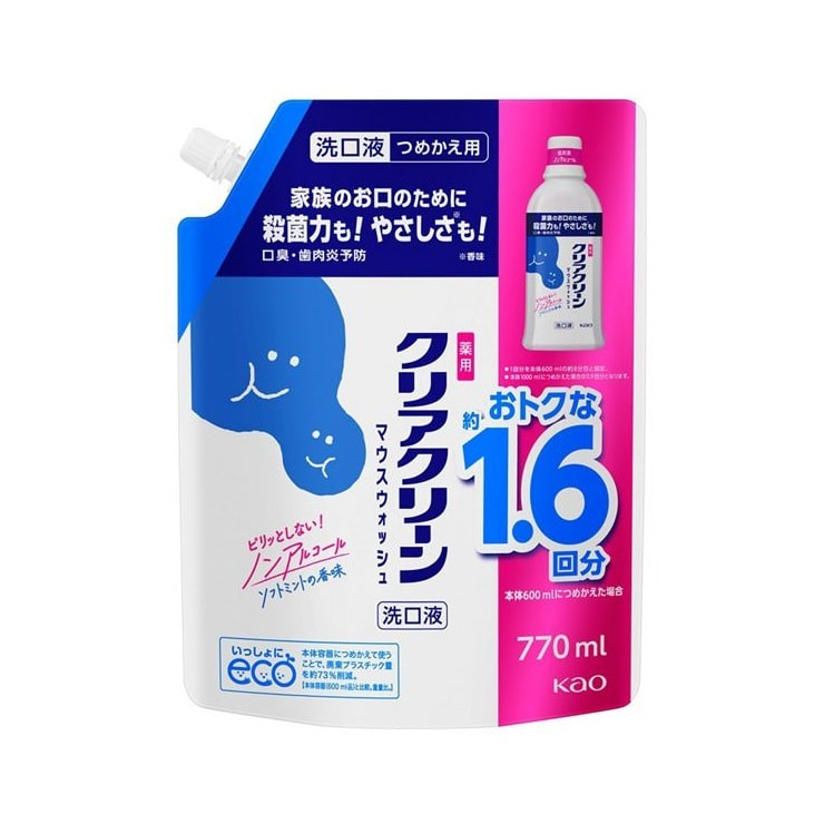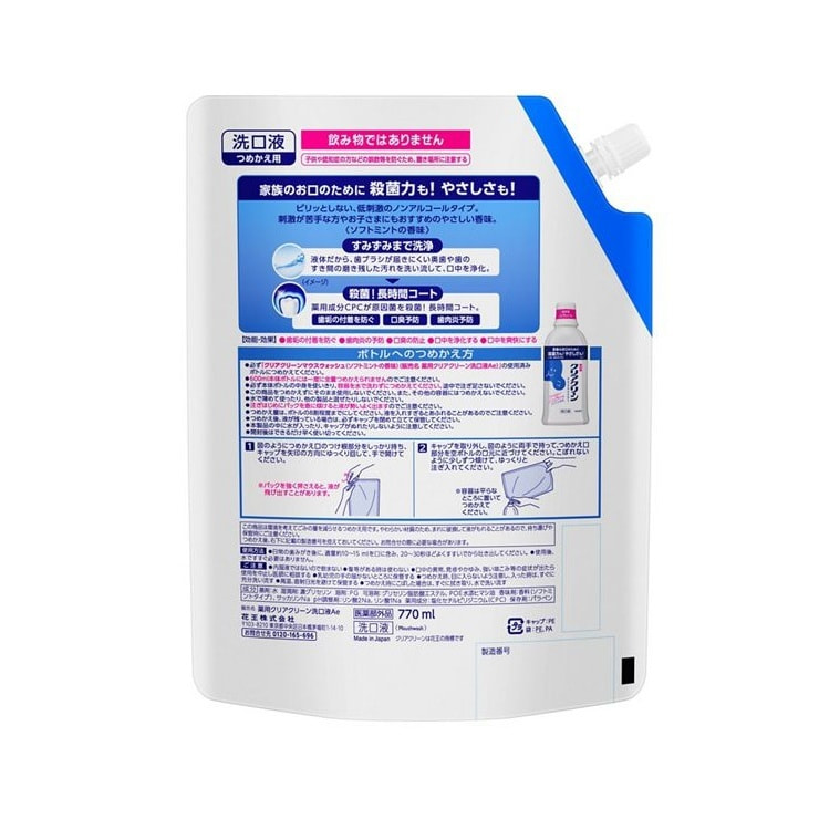 KAO "Clear Clean" Ополаскиватель полости рта для всей семьи, длительного действия с покрывающим компонентом, без спирта, вкус нежной мяты, сменная упаковка, 770 мл.