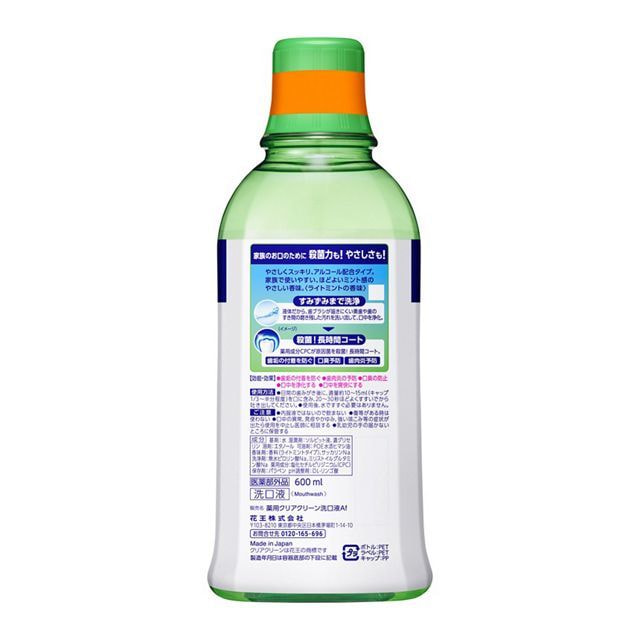 KAO "Clear Clean" Ополаскиватель полости рта длительного действия с покрывающим компонентом, со спиртом, со вкусом легкая мята, 600 мл.