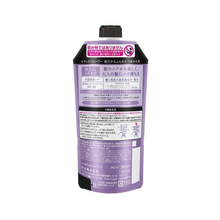 KAO "Segreta" Антивозрастной шампунь для увеличения прикорневого объёма длинных волос, аромат розы, сменная упаковка, 340 мл.