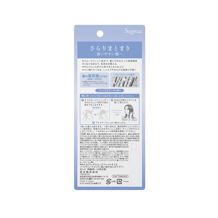 KAO "Segreta Smooth Fit" Восстанавливающее масло для придания ухоженного вида волосам, с экстрактами граната, эвкалипта и шиповника, антивозрастной уход, 60 мл.