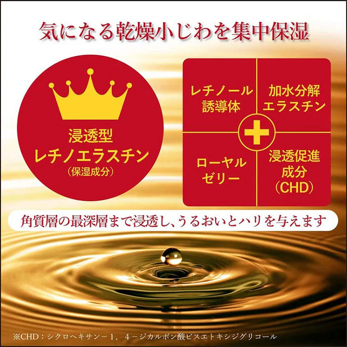 Входящие в состав "Комплекс Золотой Ретинол EX" (дериват ретинола + экстракт маточного молочка + экстракт шлемника) проникает глубоко в роговой слой кожи, увлажняет её и придаёт упругость.