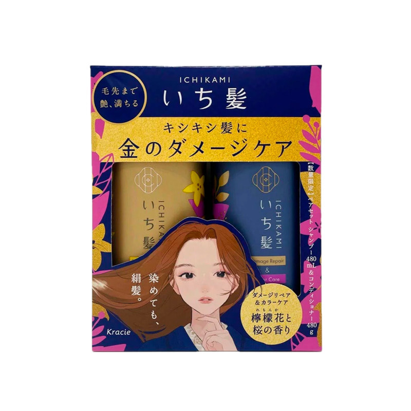 Kracie "Ichikami Damage Repair&Color Care" Набор для восстановления окрашенных волос, с ароматом цветков лимона и цветущей вишни, шампунь 480 мл. + кондиционер 480 г.