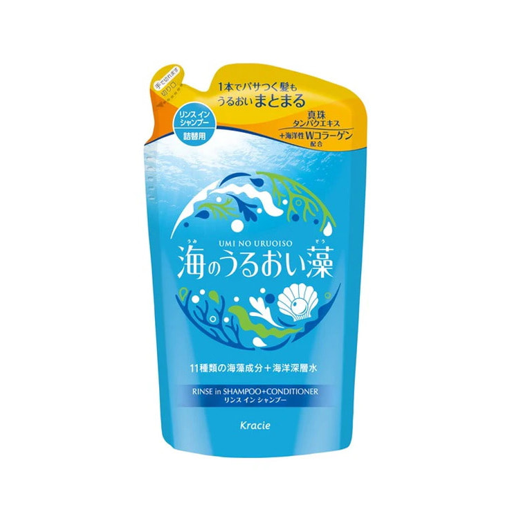 Kracie "Umi No Uruoiso Moisture Care" Увлажняющий шампунь-кондиционер для волос 2-в-1 с экстрактами морских водорослей, с освежающим цветочно-морским ароматом, сменная упаковка, 380 мл.