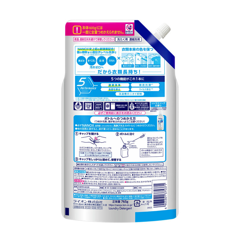 Lion "Nanox One" Высококонцентрированное жидкое средство для стирки белья, против стойких загрязнений, неприятных запахов и изменений цвета, цитрусовый аромат, сменная упаковка, 765 г.