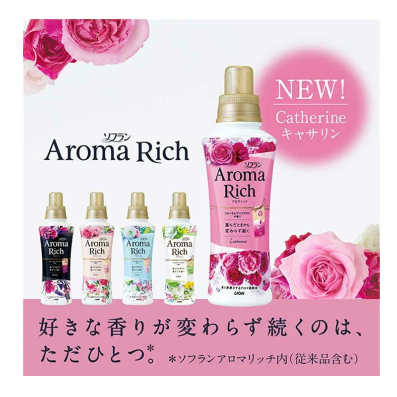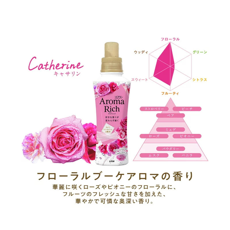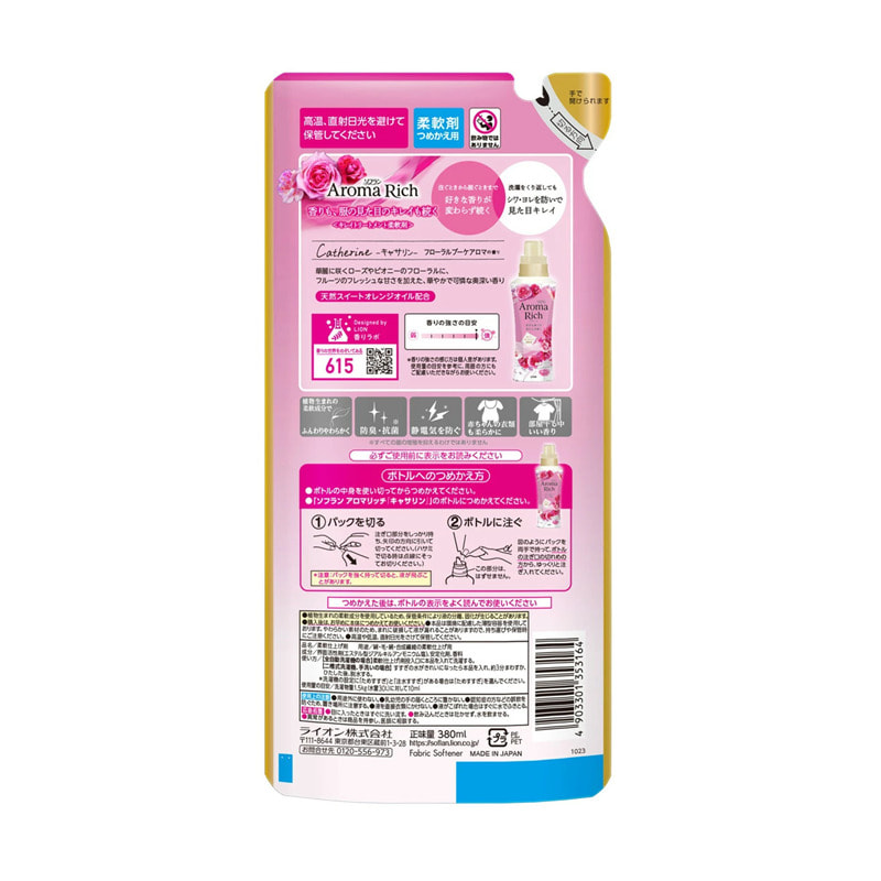 Lion "Soflan Aroma Rich Catherine" Кондиционер для белья с ароматом клубники, персика, розы и пиона, сменная упаковка, 380 мл.
