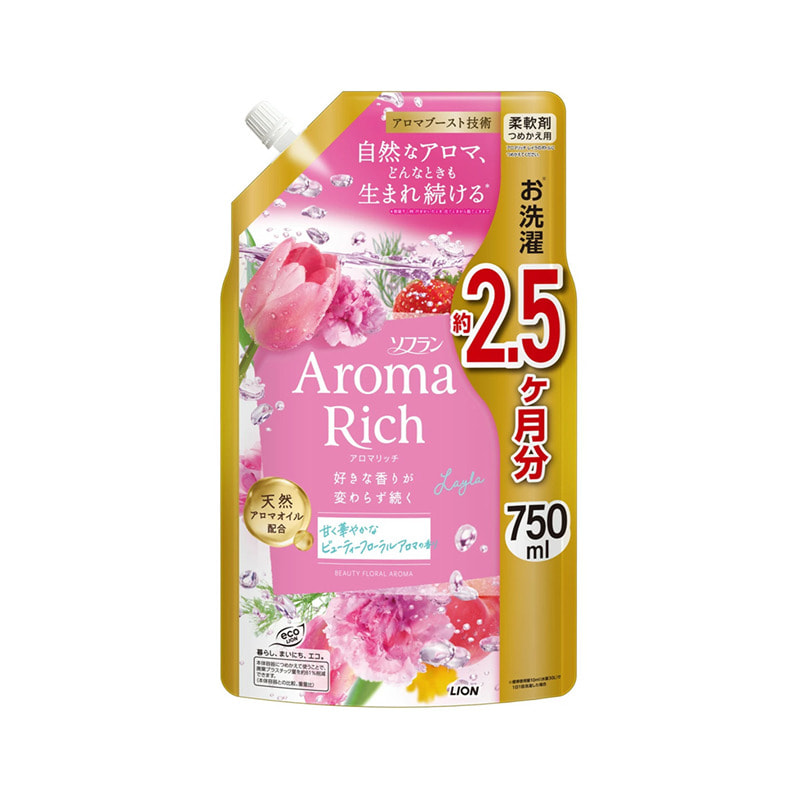 Lion "Soflan Aroma Rich Layla" Кондиционер для белья с богатым ароматом натуральных масел, с фруктово-цветочным ароматом, сменная упаковка, 750 мл.