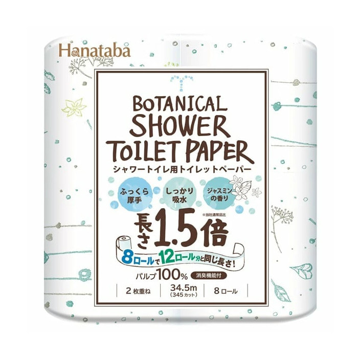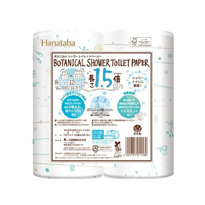 Marutomi "Tissue Hanataba Botanical Shower 1.5x Winding Double" Туалетная бумага двухслойная, увеличенной длины, с ароматом жасмина, 8 рулонов по 34,5 м.
